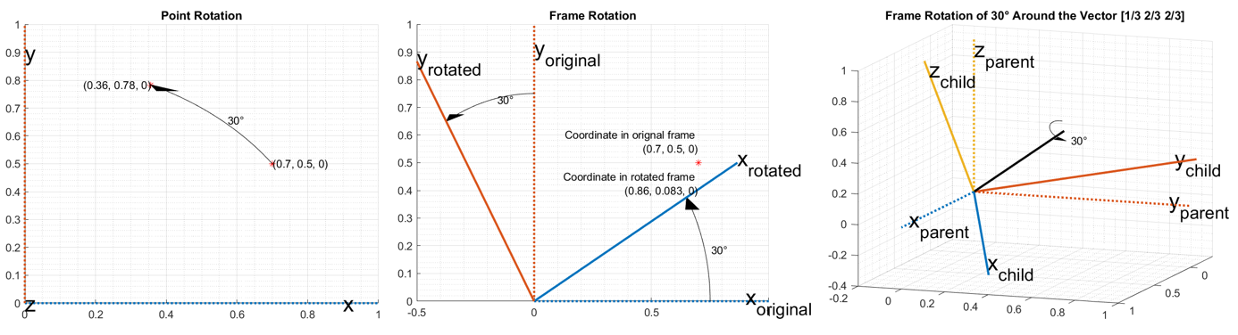 - 쿼터니언을 이용해 한 점을 회전시키거나 틀을 회전시켰던 것처럼, 회전행렬로도 한 점이나 틀을 회전시킬 수 있다. 쿼터니언을 회전행렬로 변환할 때 'point'인지 'frame'인지 정해주자.